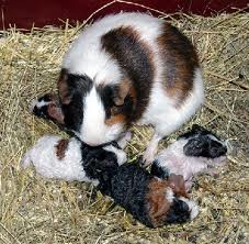Samice je březí 68dní.V jednom vrhu přichází 1 až 6mládat.porod nesmí trvat 10min to by jinak znamenalo že má morčátko problémy.Při porodu si samička přidřepne po vypuzení plodu z porodních cest vytáhne matka mládě ještě v plodových obalech,obaly otevře a následně pozře,většinou i s placentou.Mládata olíže do sucha.Jestli matka neolíže všechny do sucha osušte je pak a zahřejte sami.A když má samička více mládat měli byste nějaké kojit sami třeba kočičím mlíkem,protože samička nemá šest cecků má jen dva.Až mladata budou mít 4nebo5týdnů měli byste dát mladata pryč ,protože by samička mohla zase zabřeznout jinak by mohla umřít vyčerpáním z 1porodu.